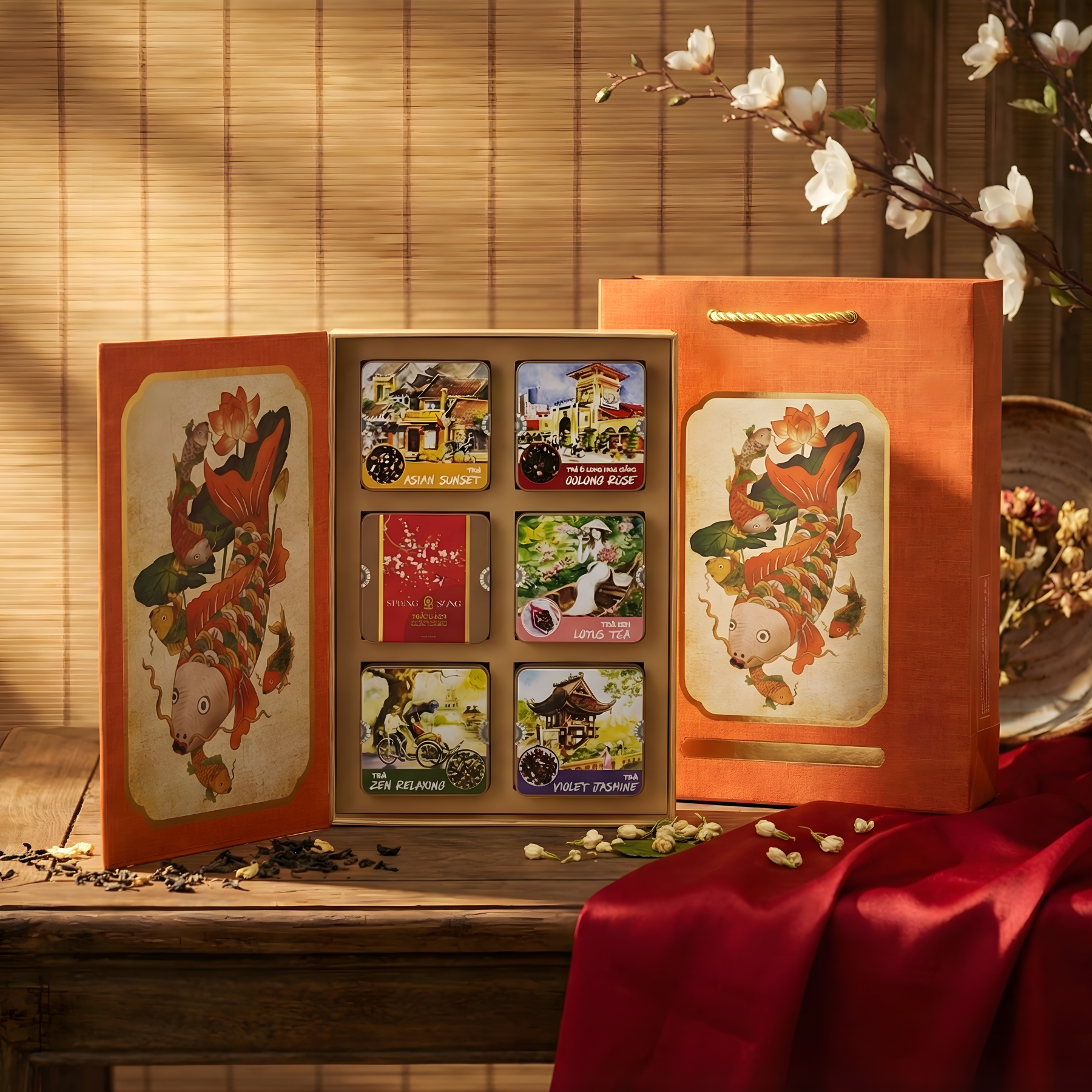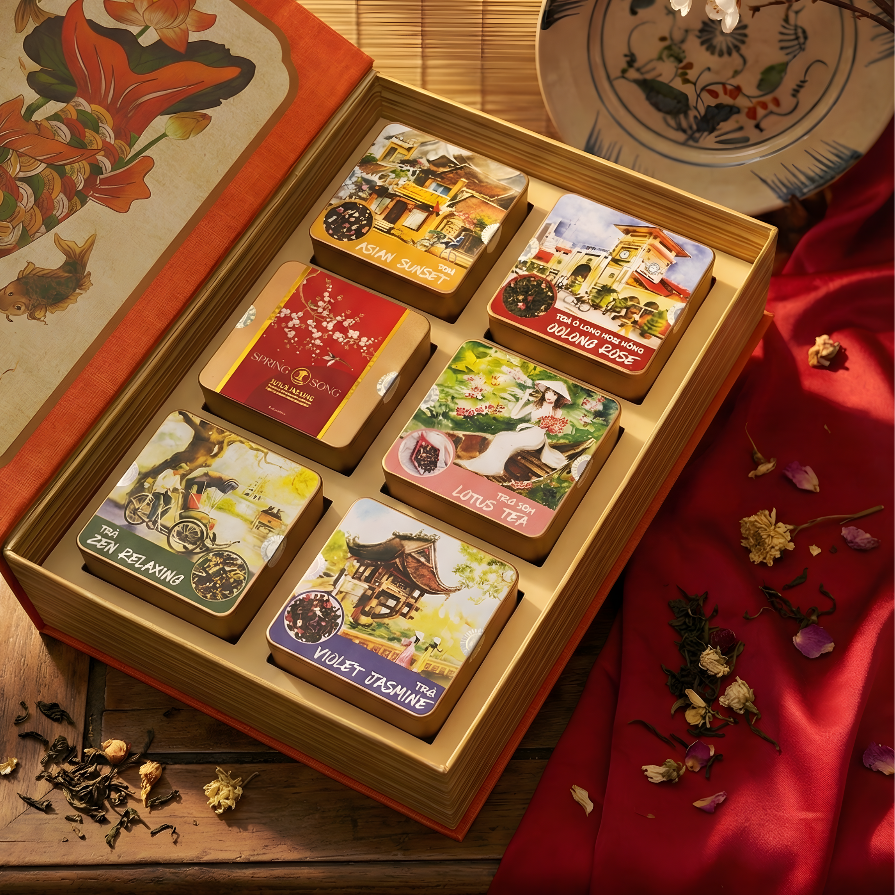 Set bao gồm 6 loại trà đặc trưng, đựng trong hộp thiếc sang trọng in họa tiết Việt Nam – tiện dụng, sang trọng, trưng bày đẹp mắt: