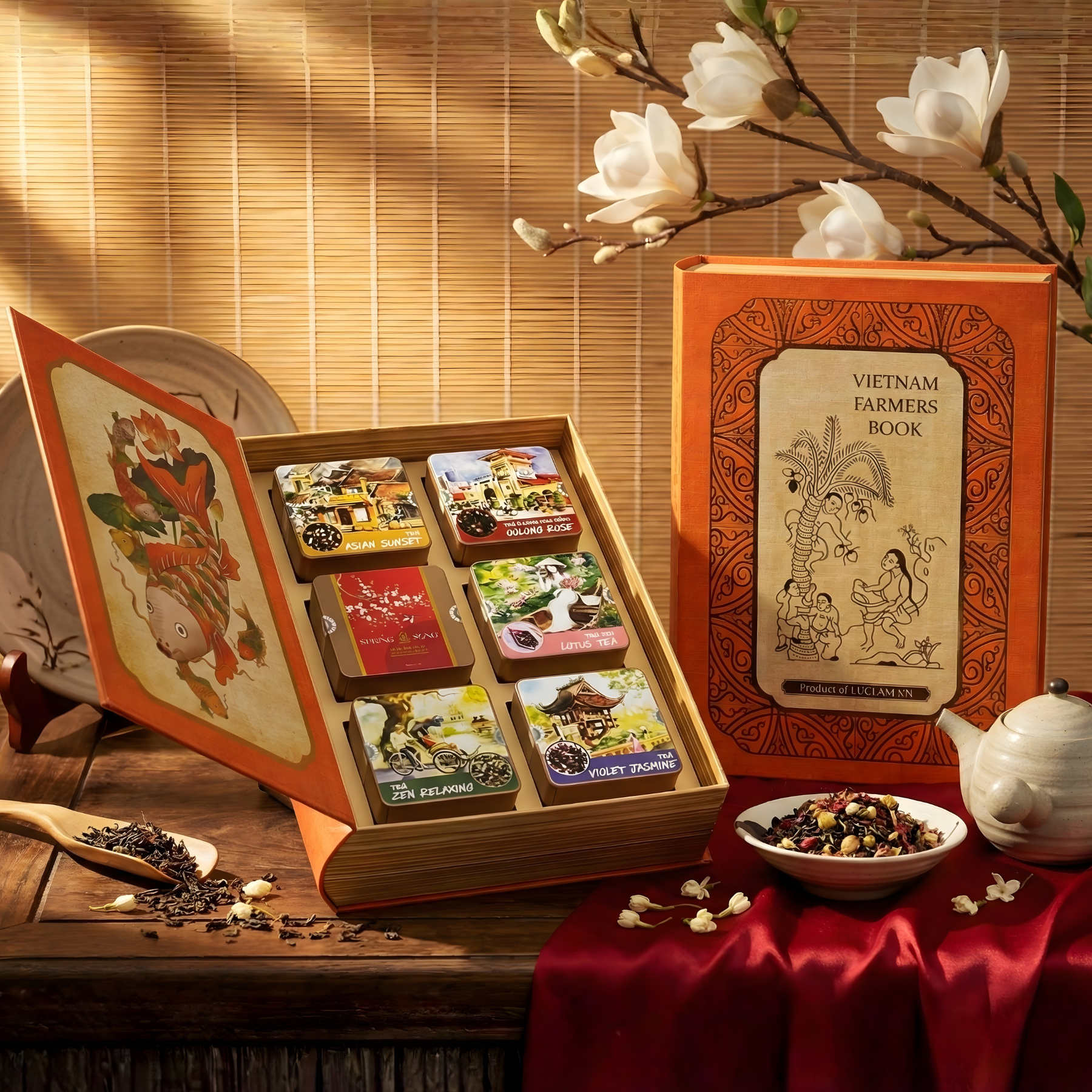 Vietnam Farmers Book là set quà Tết biểu tượng của Lục Lam – tái hiện hình ảnh làng quê Việt Nam, nghề nông truyền thống và những giá trị thuần hậu qua thiết kế dạng quyển sách cổ điển, sang trọng. Mỗi trang “mở ra” là một hương vị trà đặc sắc đến từ nhiều vùng miền, tạo nên một hành trình trải nghiệm văn hóa Việt bằng vị giác.