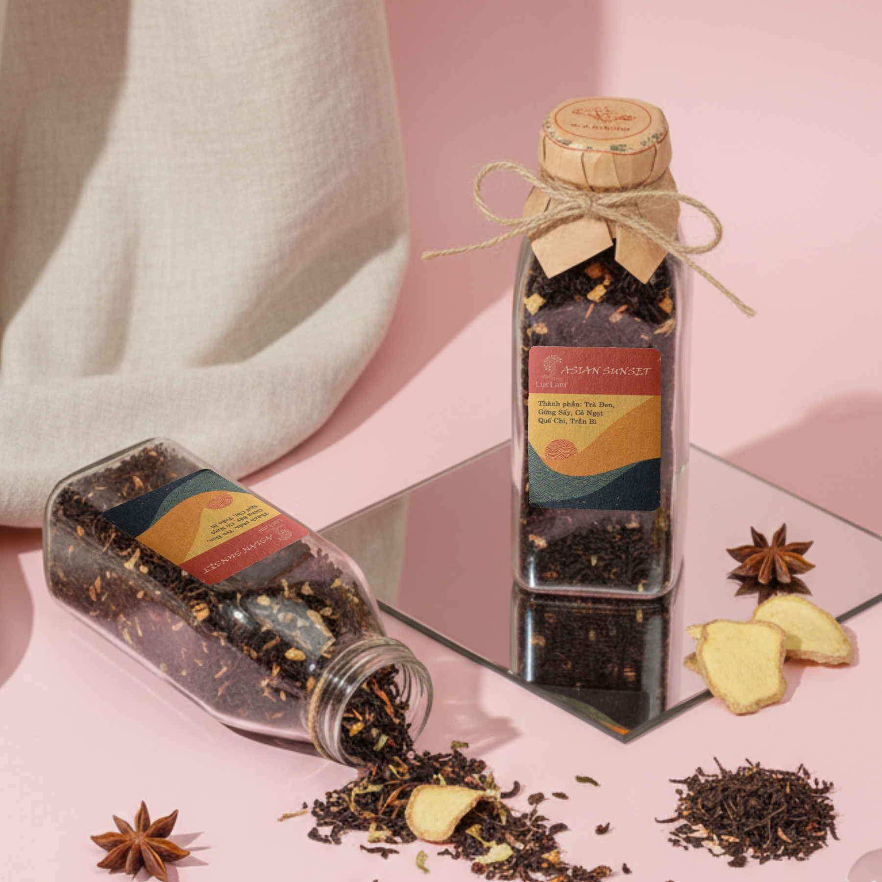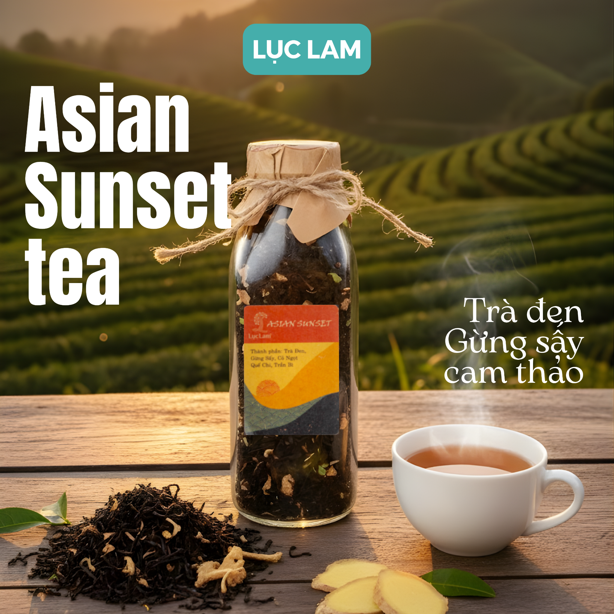 Trà Asian Sunset Lục Lam là sự hòa quyện hoàn hảo giữa trà đen, gừng tươi và cam thảo, mang đến một tách trà ấm nồng, thơm dịu và đầy năng lượng. Giống như tên gọi của nó, Asian Sunset gợi cảm giác ấm áp, lãng mạn và an yên, tựa như ánh hoàng hôn cuối ngày – nơi tâm hồn được thả lỏng và tìm lại sự bình yên sau những giờ làm việc mệt mỏi.