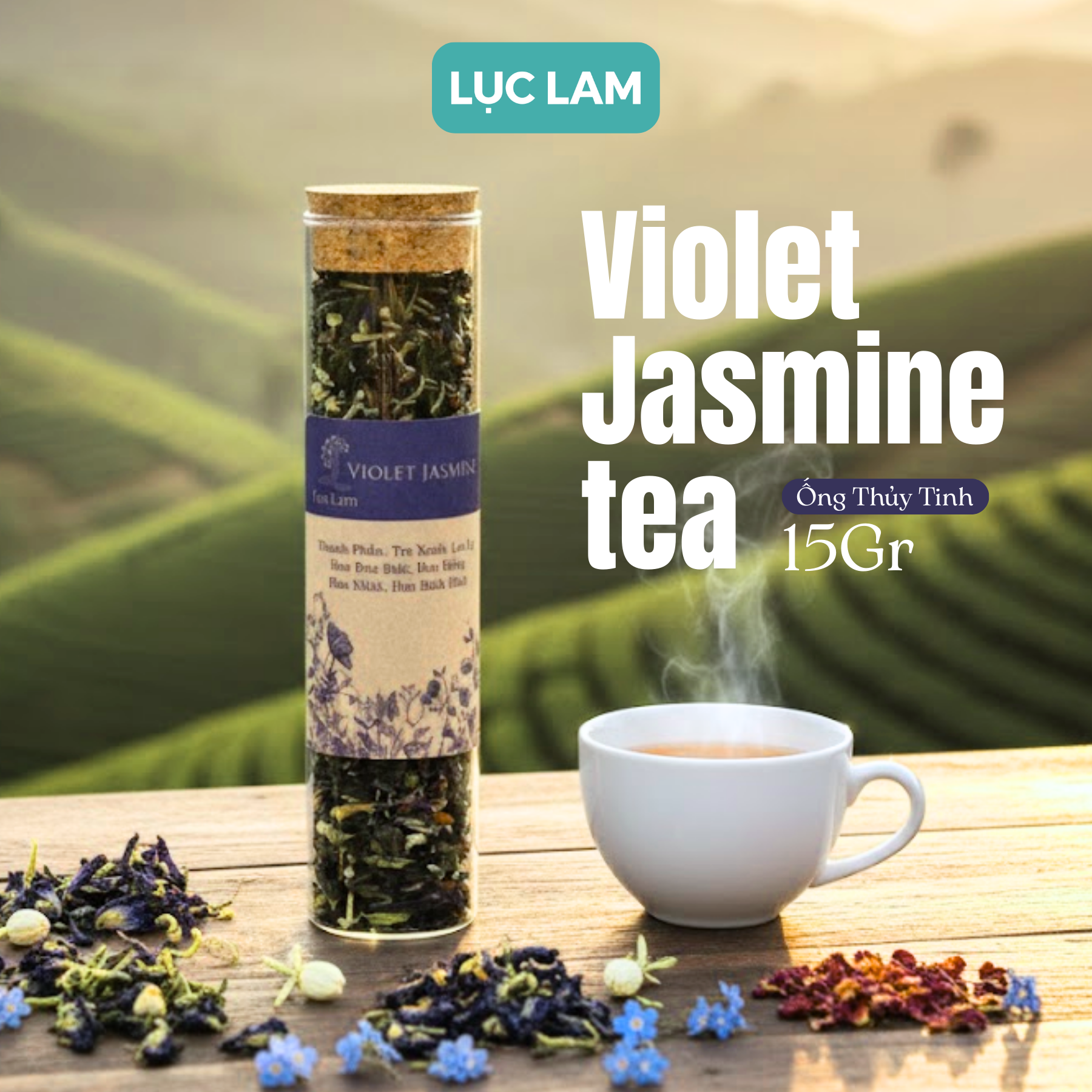 Nhắc đến tách trà Violet Jasmine đến từ Lục Lam, hẳn ấn tượng đầu tiên của người thưởng vị là sắc xanh nền nã cùng vị trà dễ chịu nhẹ nhàng. Tất cả những ấn tượng đó đều bắt nguồn từ các nguyên liệu hết sức đặc trưng được chứng nhận hữu cơ trong trà.