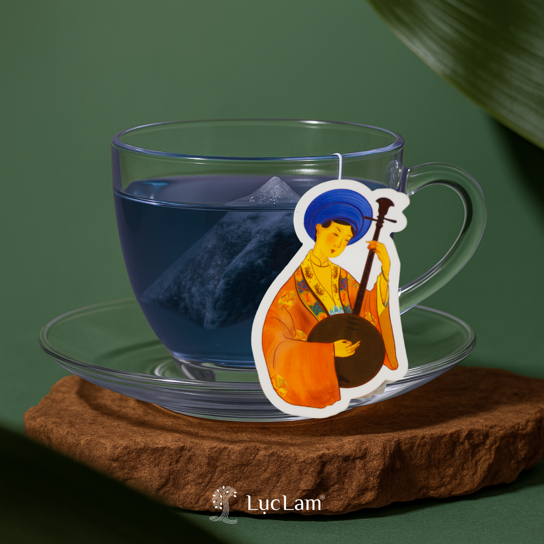 Bao bì nghệ thuật độc đáo, hộp 5 túi lọc kèm tag trà hình cô gái trong cổ phục Nhật Bình bên chiếc đàn cầm truyền thống – vừa thưởng trà vừa cảm nhận nét văn hóa Việt.